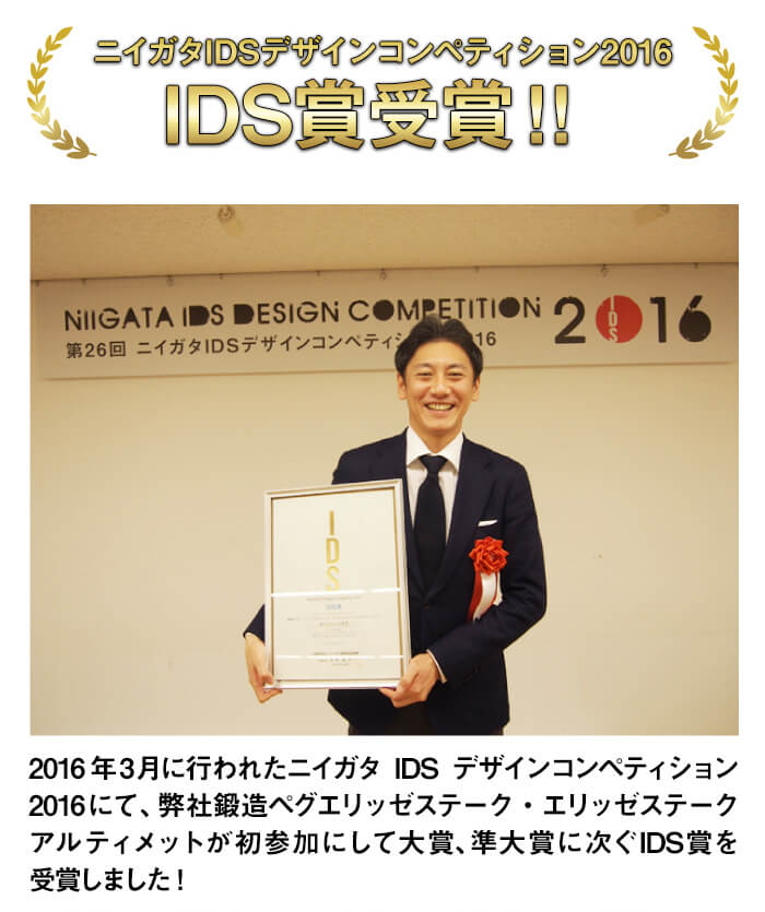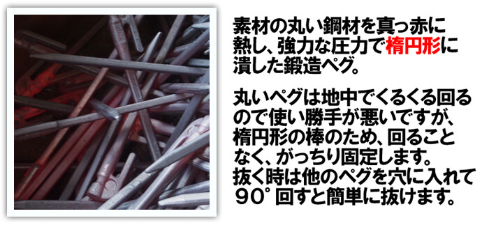 素材の丸い鋼材を約1,100℃になるまで真っ赤に熱し、約1トンという強力な力で一気に断面を楕円形に潰した鍛造ペグ。