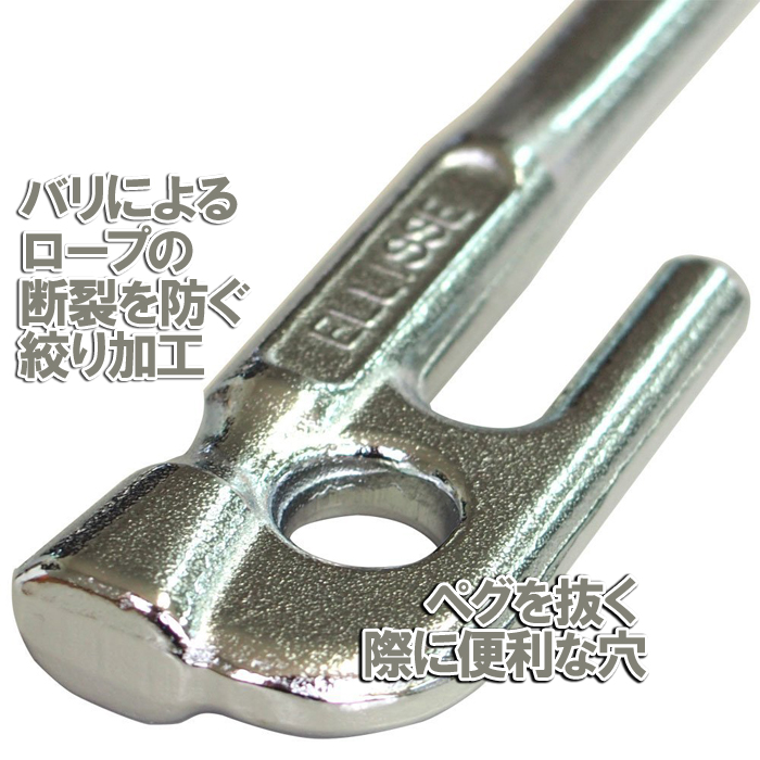 通常の丸棒のペグは地中でペグがクルクルと回り使い勝手が悪いですが、楕円のペグは、砂利や石が混じった固い地面でも入り込みが良く、地中でクルクルと回る事なく、ガッチリと固定します。