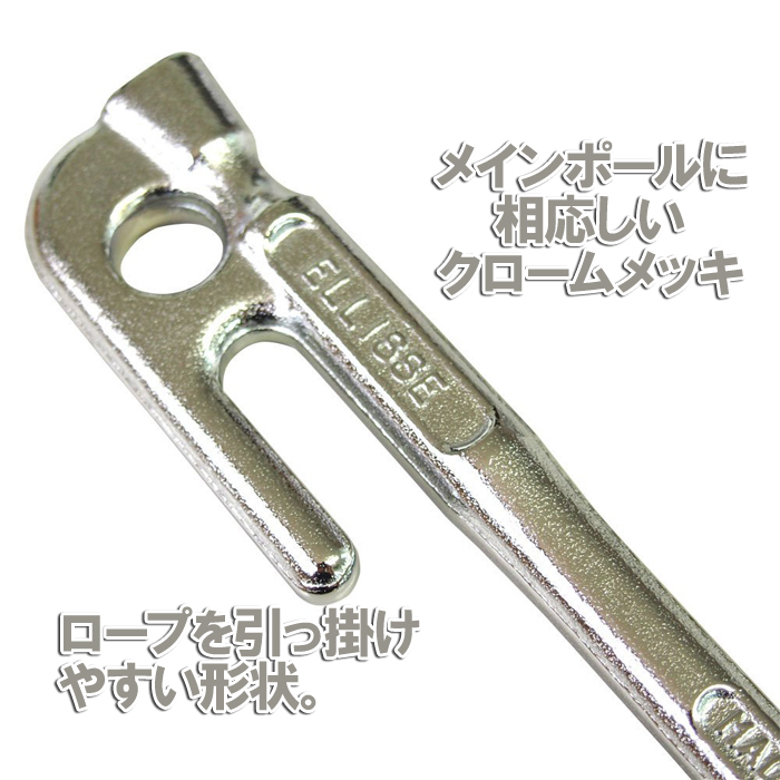 芝生や砂利などに置いたペグが目立たなくて苦労する! そんな声から、あえて色を付けました。 非常に硬く、光沢があり大気中での腐食が少ないクロームメッキ。 気品あるカラーはメインポールに最適な全長380mmです。