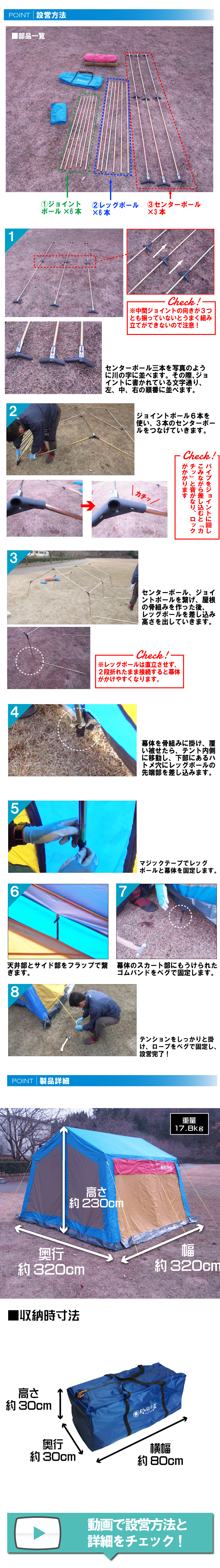 ロッジタイプなので有効面積が広く、フレーム構造なので風にも強くて頑丈。