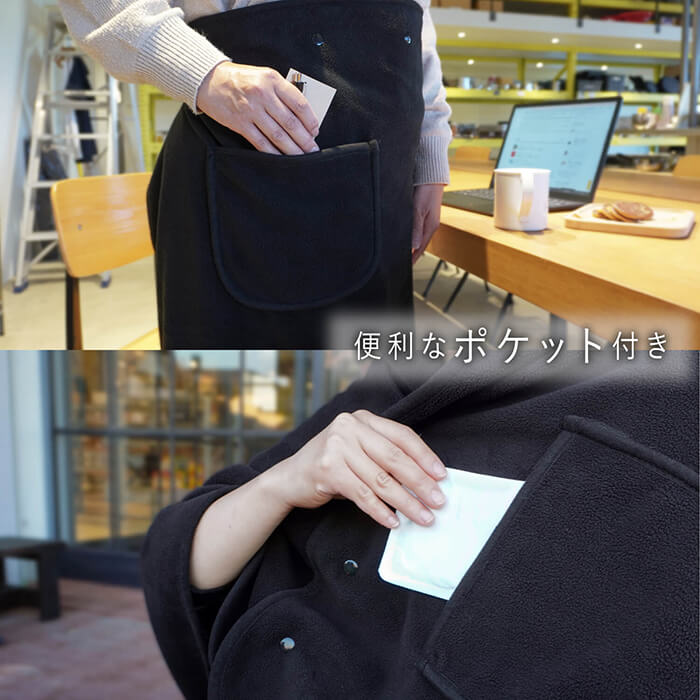 便利なポケット付き。スマホやホッカイロ、小物がすっぽり入る幅広のポケットです。