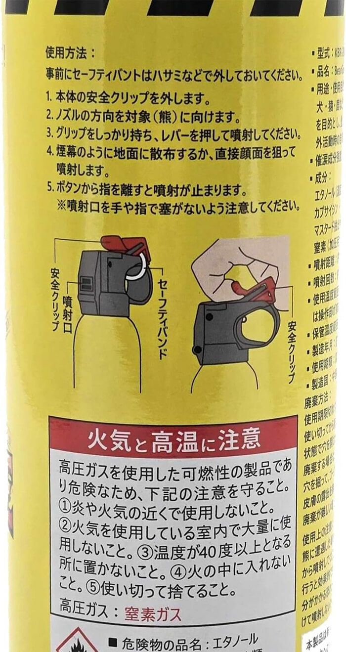 他の画像を見る 強力刺激ダブル効果で熊を忌避! 熊避けスプレー 臭い&刺激 くまいちばん 140ml 強力刺激ダブル効果でクマを忌避!※撃退スプレーではありません、忌避スプレーです。 税込価格 ¥ 5,808 税込 カートに入れる お気に入りに登録する