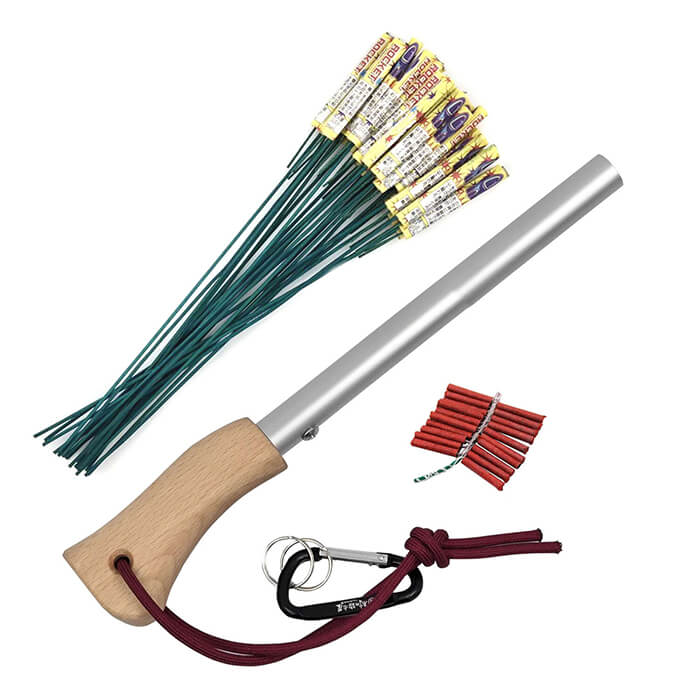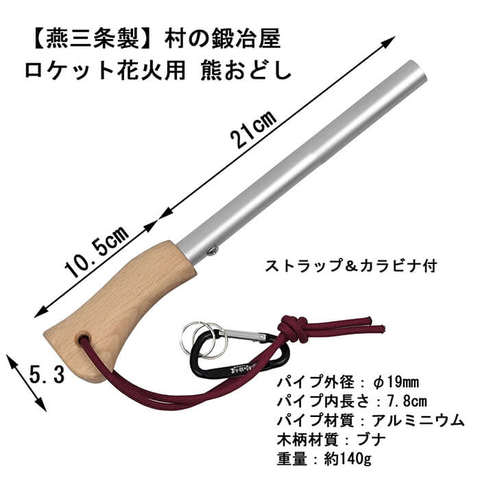 【熊おどしロング爆竹・ロケット花火付き】村の鍛冶屋 熊おどしロングパイプ ロケット花火25本+爆竹20本付 アルミ 木柄 カラビナ付【燕三条製】