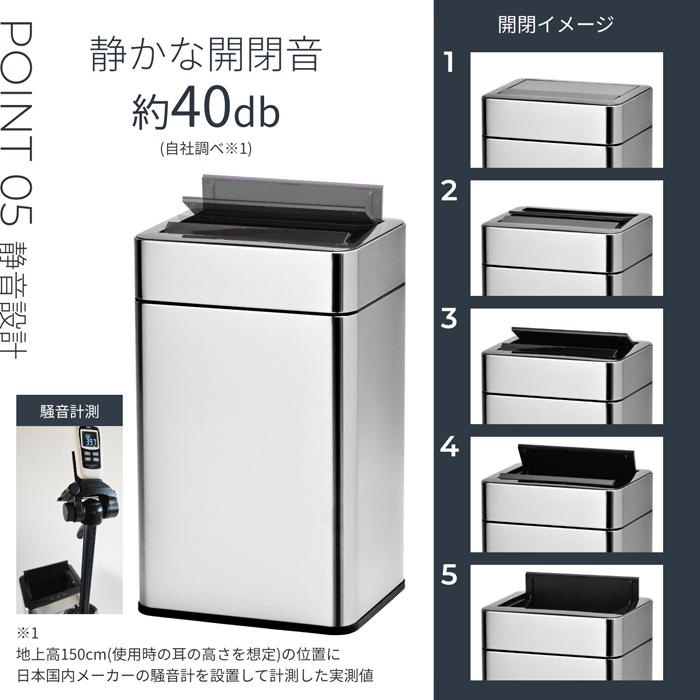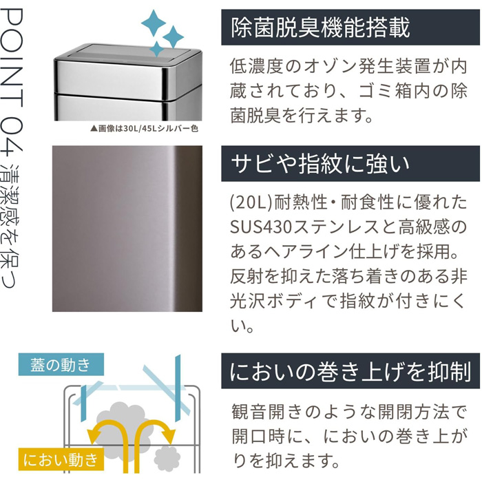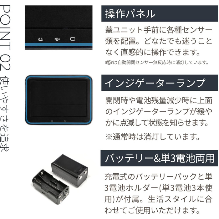 新方式の格納式両開き蓋は、蓋が上に開かないので、蓋が開く際の匂いの巻き上げを抑えます。