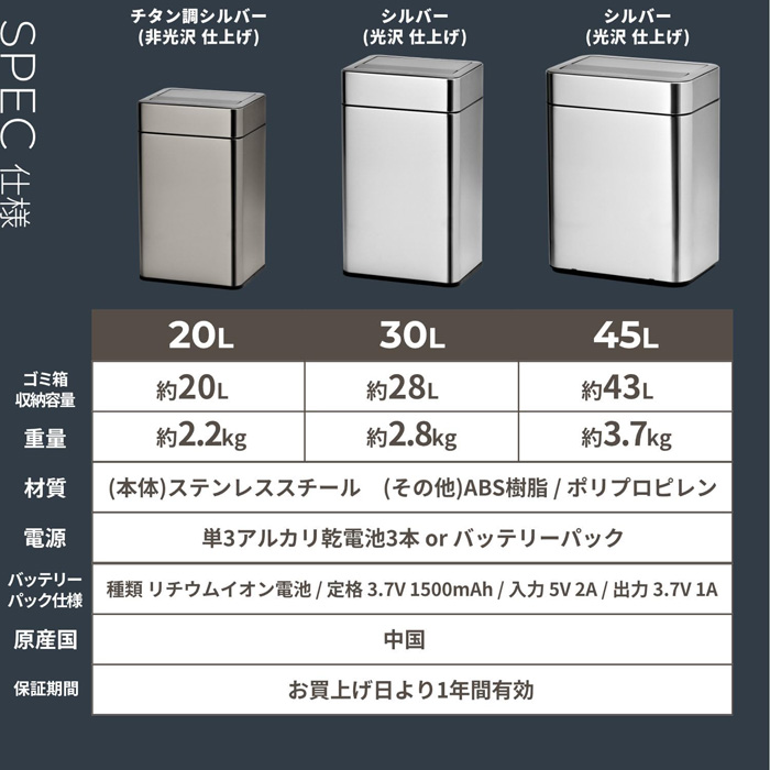 センサーの上部に手をかざすだけで蓋が自動開閉する、センサー式のステンレス製ゴミ箱です。
