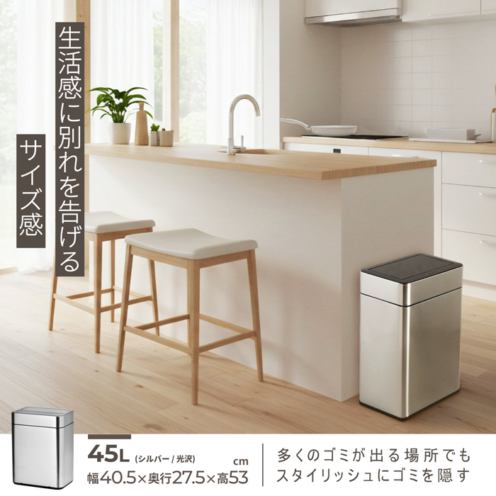 センサーの上部に手をかざすだけで蓋が自動開閉する、センサー式のステンレス製ゴミ箱です。
