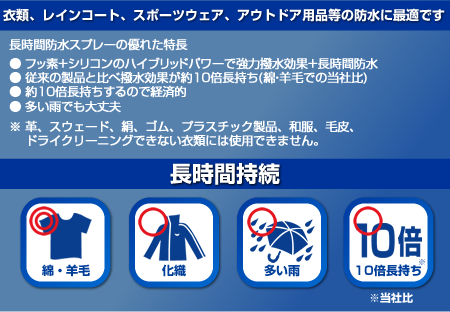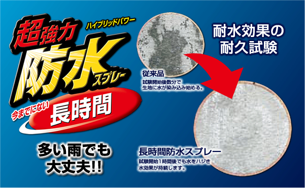 今までにない長時間防水。フッ素+シリコンのハイブリットパワーで協力撥水効果+長時間撥水