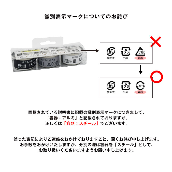 同梱されている説明書に記載の識別表示マークにつきまして、「容器:アルミ」と記載されておりますが、正しくは「容器:スチール」でございます。