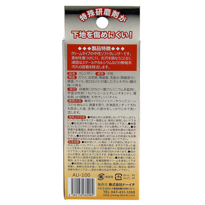 材質:研磨剤(35%ケイ酸アルミニウム系鉱物)、界面活性剤(1%アルコールエチレンオキシド)、増強剤、pH調整剤、天然オレンジオイル