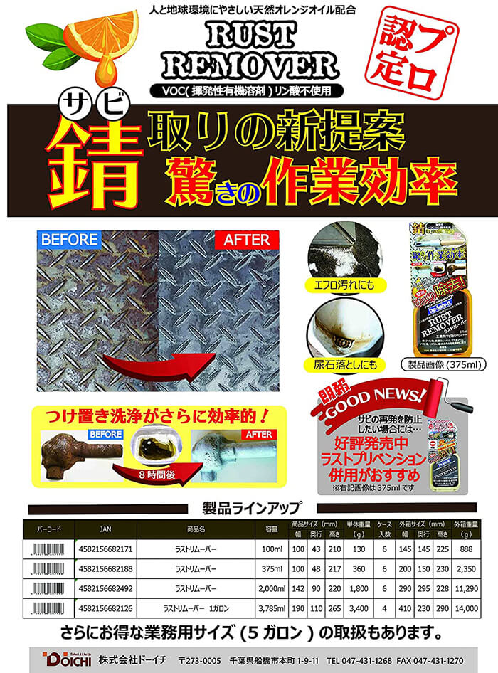 1.汚れ部分に噴霧し、浸透するまで待ち、その後水拭き、防錆剤は入っていませんので、必要に応じて防錆剤塗布。