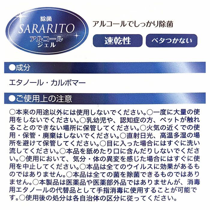 他の画像を見る アルコールでしっかり除菌! SARARITO サラリト アルコール除菌ハンドジェル 500ml水がいらない便利なジェルタイプ!速乾性でベタつかず、しっかり除菌できます。成分:エタノール・カルボマー【頑張って送料無料!】 税込価格 ¥ 2,470 税込 カートに入れる お気に入りに登録する