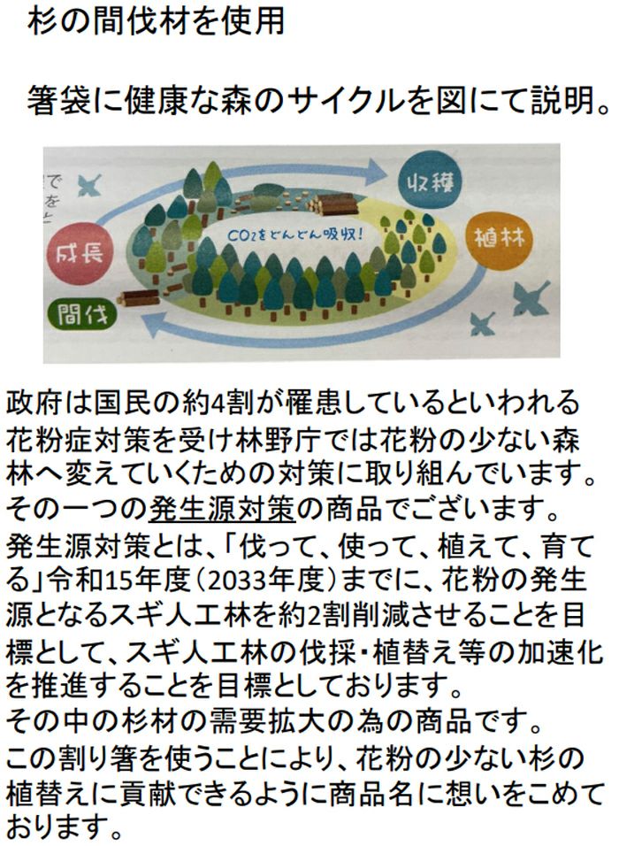 他の画像を見る 使えば花粉の少ない杉の植替え加速化 日本製 日本のスギ花粉を減らせる割箸元禄箸20本袋入り20.5cmと使いやすい箸袋入り割り箸【ネコポス配送】【沖縄・離島でも頑張って送料無料!】 税込価格 ¥ 770 税込 詳細を見る お気に入りに登録する