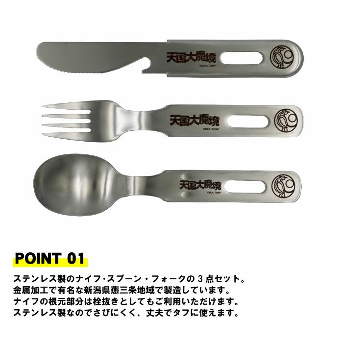 他の画像を見る アニメ『天国大魔境』とのコラボアイテム! 【TDM-002】天国大魔境 ステンレスカトラリーセットロゴとマークを刻印した燕三条製のカトラリーセット 税込価格 ¥ 2,090 税込 カートに入れる お気に入りに登録する