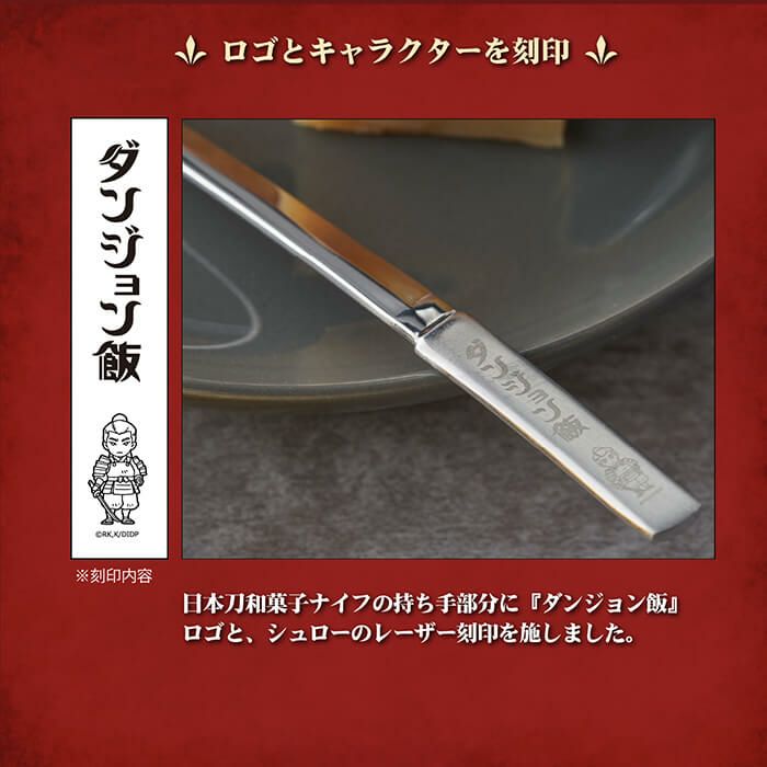 他の画像を見る アニメ『ダンジョン飯』とのコラボアイテム第二弾! 【DGM-017】ダンジョン飯 日本刀和菓子ナイフ(シュロー)『ダンジョン飯』キャラクターとロゴを刻印燕三条製ネコポス配送 税込価格 ¥ 1,100 税込 カートに入れる お気に入りに登録する