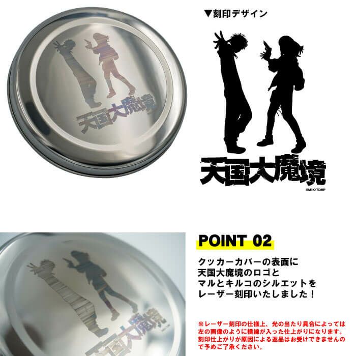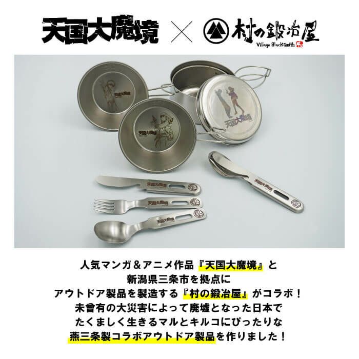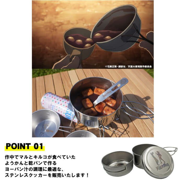 他の画像を見る アニメ『天国大魔境』とのコラボアイテム! 【TDM-001】天国大魔境 ヨーパン汁用ステンレスクッカー3pcロゴ&キャラクターシルエット刻印した燕三条製の軽量クッカー 税込価格 ¥ 3,850 税込 カートに入れる お気に入りに登録する