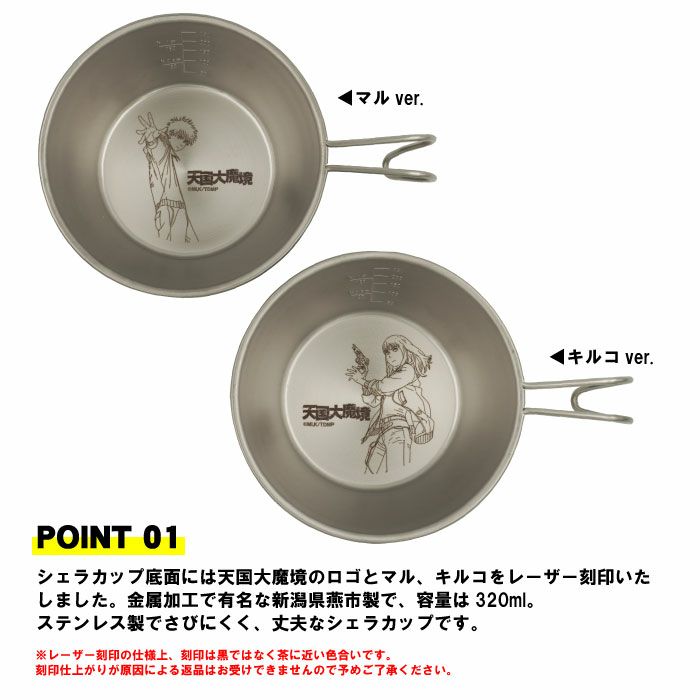 他の画像を見る アニメ『天国大魔境』とのコラボアイテム! 【TDM-003・TDM-004】天国大魔境 ステンレスシェラカップ マルver. キルコver.ロゴとキャラクターを刻印した燕三条製のシェラカップ 税込価格 ¥ 1,980 税込 詳細を見る お気に入りに登録する